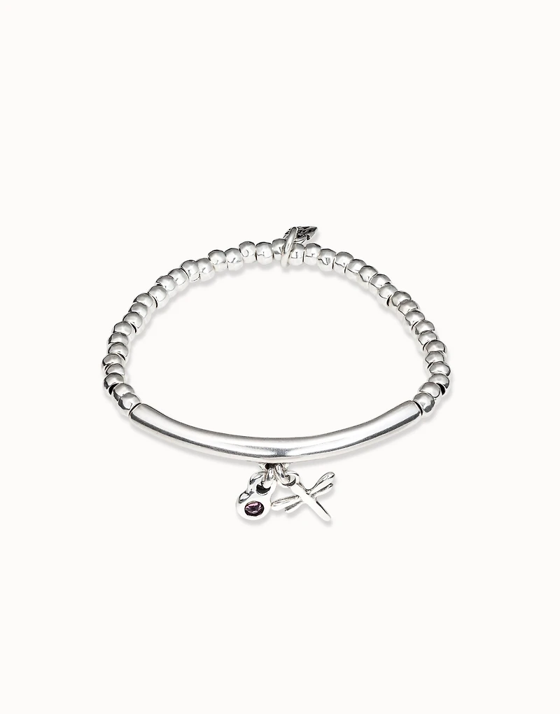 The Drag Me Fly bracelet features a charm with a purple crystal and a dragonfly. Elasticated for added convenience, this piece is handmade in Spain using a silver-plated metal alloy. Wear this bracelet with the rest of the pieces from the collection for a one-of-a-kind look.