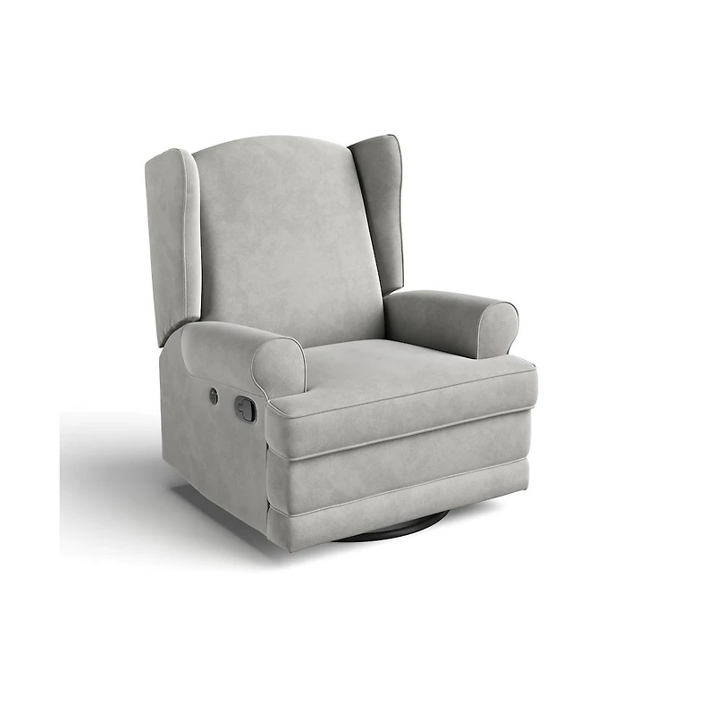 The Storkcraft Serenity Wingback Upholstered Recliner Glider offers classic design with modern comfort. Featuring a durable metal 360-degree swivel base, smooth ""glide and recline"" function, and plush cushioning, it ensures relaxation for parents and baby. A built-in Usb charging port (2 slots) keeps devices powered. Upholstered in water-repellant, eco-friendly fabric, it reclines fully with leg support for added comfort. Backed by a 1-year warranty and Storkcraft s customer care. Proud winner of the Women s Choice Award for Baby and Kids Furniture.