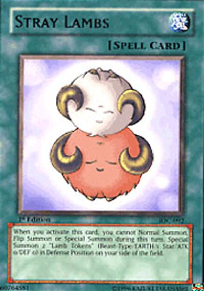 Card Rules: Rulings powered by The Netrep Passcode: 60764581 Set: Invasion of Chaos Card Number: IOC-092 Rarity: Rare Attribute: Spell Card Text: If you activate this card , you cannot Normal Summon Flip Summon or Special Summon during this turn. Special Summon 2 'Lamb Tokens' (Beast-Type/EARTH/Level 1/ATK 0/DEF 0) in Defense Position on your side of the field. Card Type: Normal Spell Name: Stray Lambs Edition: Unlimited