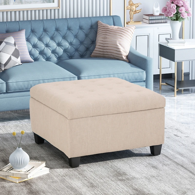 Elevate your home's style and declutter with our storage ottoman. Its refined upholstery and tufted waffle stitching add a contemporary touch, making it a versatile addition to any room.