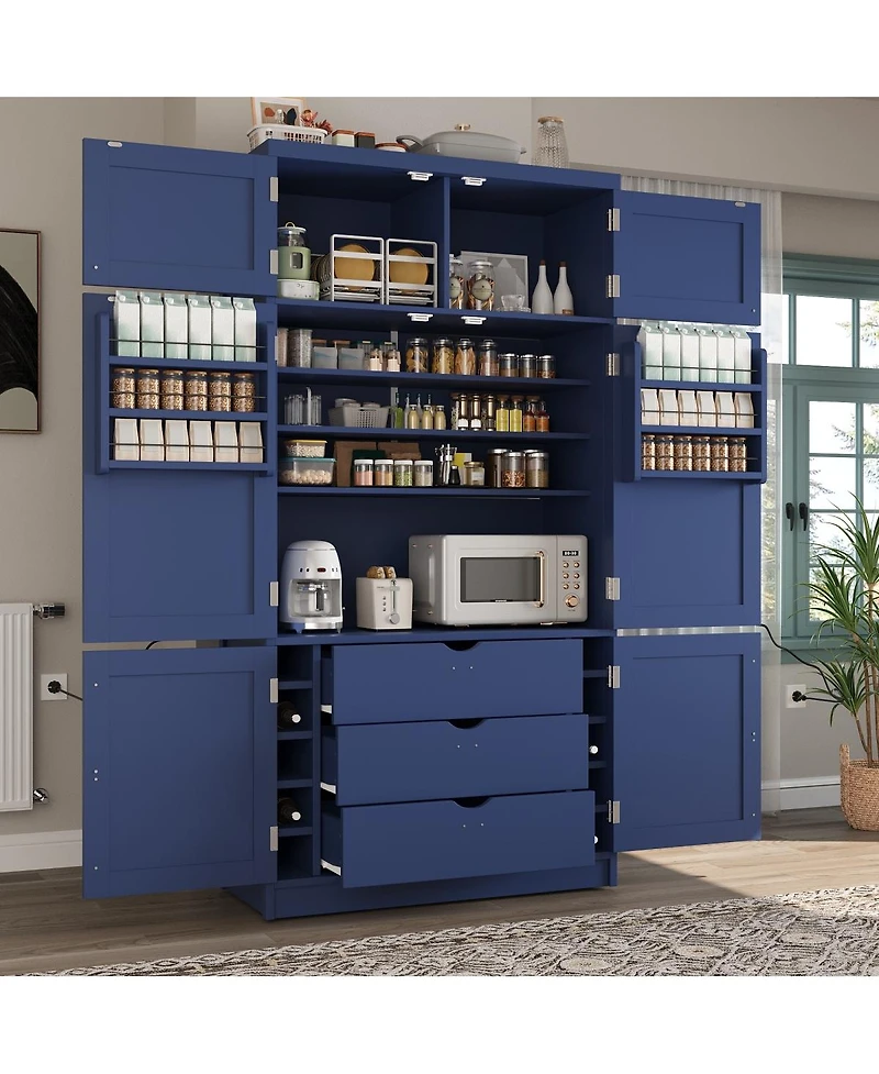 Maximize kitchen space with this versatile pantry! Features 6 doors, 3 drawers, 10 wine racks, adjustable shelves, and built-in power outlets with Usb ports. Its extra-wide, tall design offers ample storage for appliances and dry goods.
