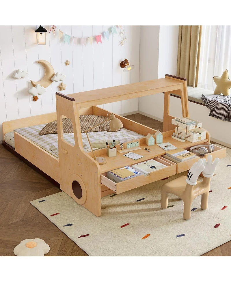 Ignite imagination with this full-size car-shaped floor bed! Features playful design, built-in storage, a desk, and kid-friendly construction for safe, independent fun. Easy assembly.