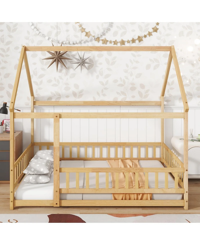 Streamdale Furniture Full Size House Floor Wooden Bed with Roof Frame Safety Guardrails Natural in San Juan, PR