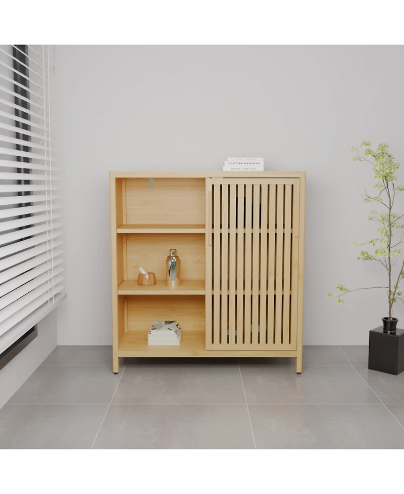 Maximize space with this slim bamboo cabinet! Features open shelves and a cabinet for hidden storage. Perfect for bathrooms, kitchens and more. Easy assembly.