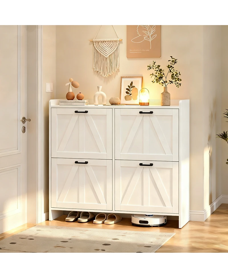 Modern barn door shoe cabinet with 4 flip compartments. 4.3"" clearance fits robot vacuums! Slim design, stylish entryway storage.
