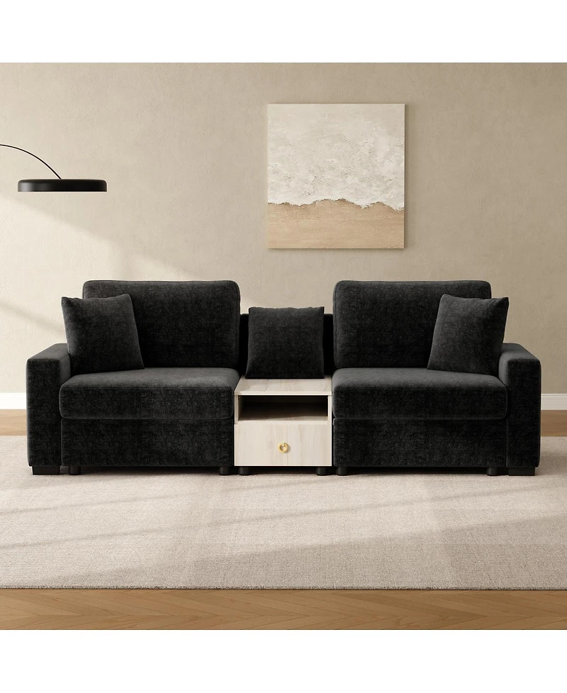 This chenille sofa offers smart storage with a built-in armrest console and drawer. Enjoy customizable comfort with removable plush pillows and a supportive 20.5" deep seat. Perfect for modern living.