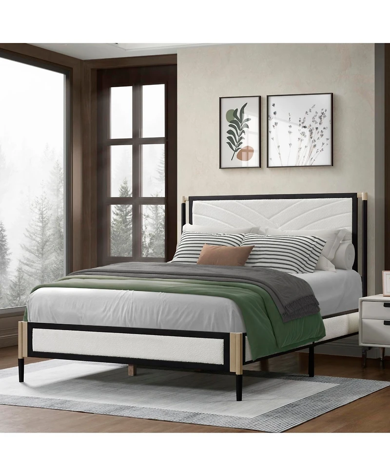 Queen platform bed: White boucle headboard, champagne silver and black frame. Modern, cozy design. Supports 800lbs, no box spring needed. Easy assembly.