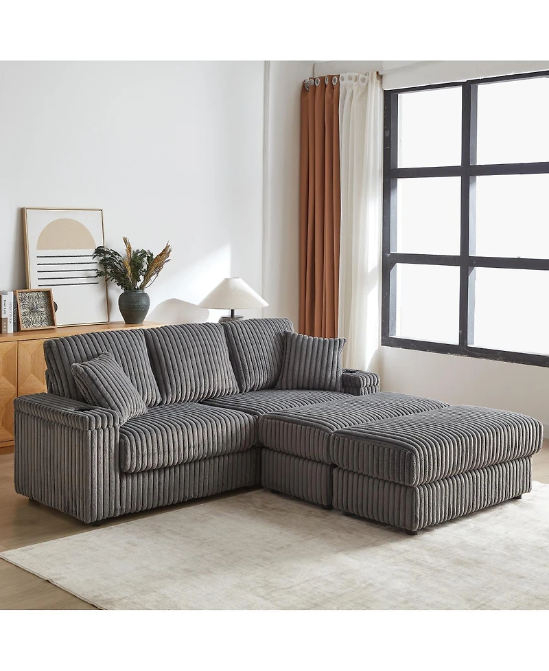 Streamdale Furniture Streamdale 84" Corduroy 3-Seater Sofa w/ Pillows, Ottomans, Storage & Cup Holders