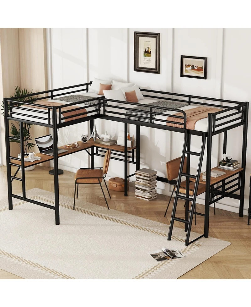 Versatile black metal twin loft bed with L-shaped design and two built-in desks. Durable metal and Mdf construction ensures stability and style, perfect for sleepovers or guest rooms.