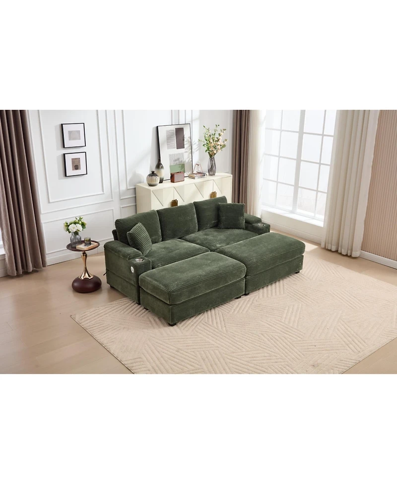Corduroy sectional sofa with Usb, cupholders, and modular design. Soft foam cushions, wood frame. 86"L x 56"W. Easy assembly.