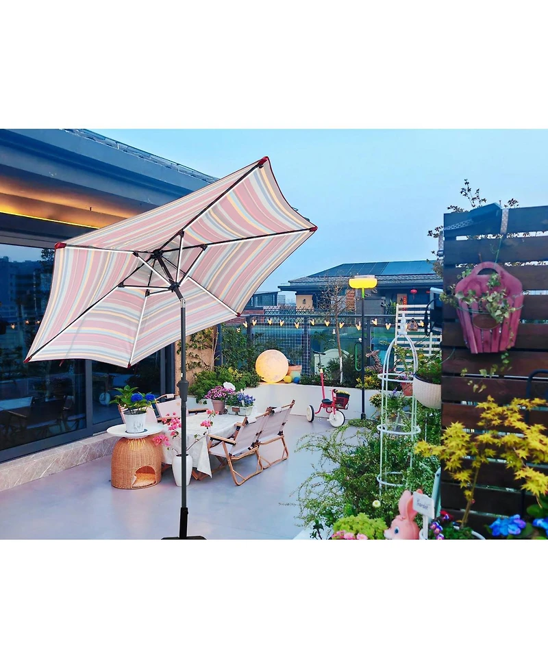 Enjoy sunny days with this red striped patio umbrella. Features a crank lift, push-button tilt, and built-in solar Led lights for evening ambiance. (Base not included).