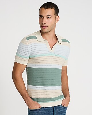 This short sleeve sweater polo features a textured striped print and a Johnny collar.