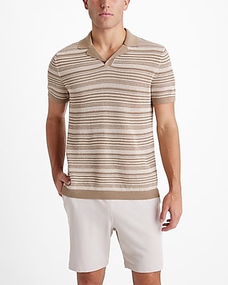 This sweater polo is complete with short sleeves, a striped knit pattern, and a Johnny collar.