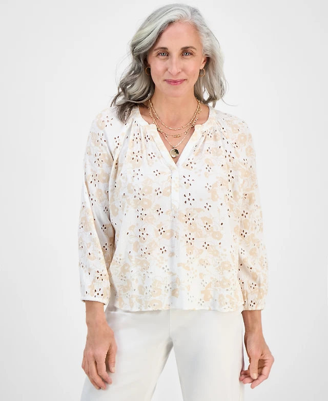 Style & Co Petite Floral Print Pima Cotton 3/4-Sleeve Top, Exclusively at Macy's