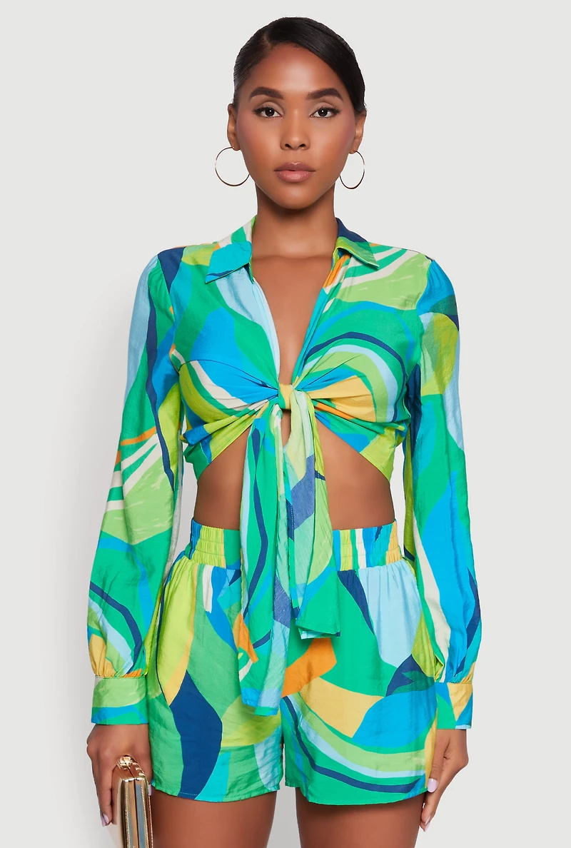 Stylish Crepe Knit Geometric Print Tie Front Crop Top in San Juan, PR