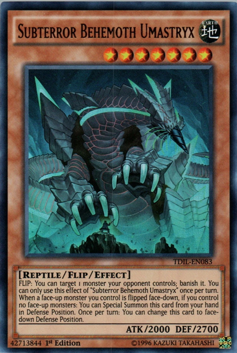 Card Number: TDIL-EN083 Rarity: Ultra Rare Card Type: Effect Monster Name: Subterror Behemoth Umastryx Edition: 1st