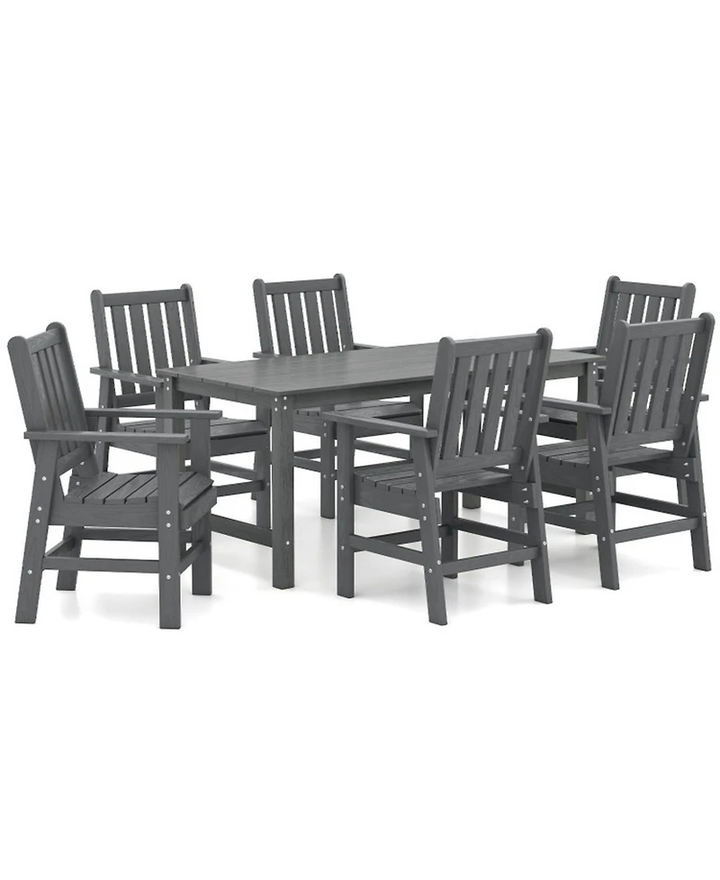 Gather friends for open-air meals with a 7-piece dining set that brings warm wood-look style to your outdoor area. A spacious rectangular table and six armchairs create an inviting setup for family dinners, weekend hosting, and relaxed evenings by the pool, while the durable build is made for seasons of everyday use.