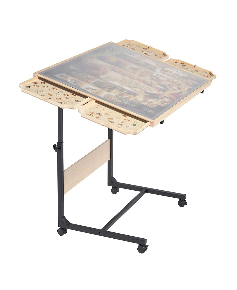 Experience puzzle-solving comfort with this 1500-piece jigsaw puzzle table set featuring an adjustable height and tiltable tabletop. Measuring 35×26 in overall with a 34×25 in puzzle area, it s crafted from natural pine wood and supported by reinforced metal legs with folding hinges. Four sliding drawers organize pieces neatly, while the transparent Pp cover shields your progress from dust, spills, and pets. The mobile caster wheels make it easy to move, serving as a puzzle table, standing desk, or craft station for home use.(Warning: Ensure all hinges, locks, and wheels are securely engaged before use; place on a flat surface only and keep children supervised during adjustment or movement to prevent tipping or pinching injuries.)