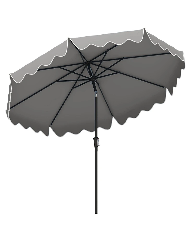 Create comfortable shade for outdoor meals and relaxing with this 9 ft patio market umbrella featuring a classic round canopy with decorative ruffled edges. The push button tilt lets you angle the canopy left or right up to 25 degrees to help block sun from changing directions, while the vented top promotes airflow for improved stability and a cooler seating area. A smooth crank handle makes opening and closing simple, and a safety latch helps keep the canopy securely in place during use. Built with a durable polyester fabric canopy and supported by a powder coated metal pole with 8 sturdy ribs, this umbrella is designed for everyday patio and poolside use. The 2 piece pole design separates for compact storage when not in use. For best results in breezy conditions, use a compatible weighted base not included to help keep the umbrella securely anchored.