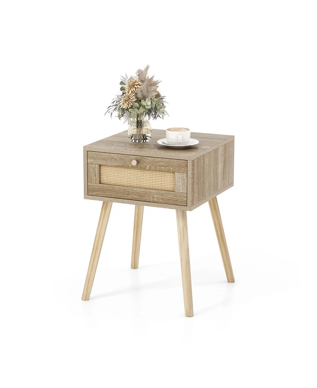 Sugift Modern Rattan Nightstand with Drawer and Solid Wood Legs for Bedroom and Living Room