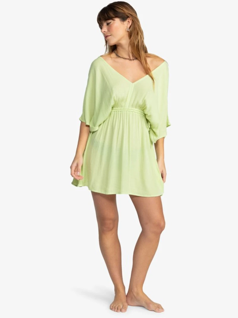 Features:- Fabric: Eco viscose fabric [110 g/m2].- Fit: Loose fit.- Neck: Deep V-neck.- Sleeves: Short sleeves.- Waist: Adjustable waist.- Closure:Adjustable waist ties closure.