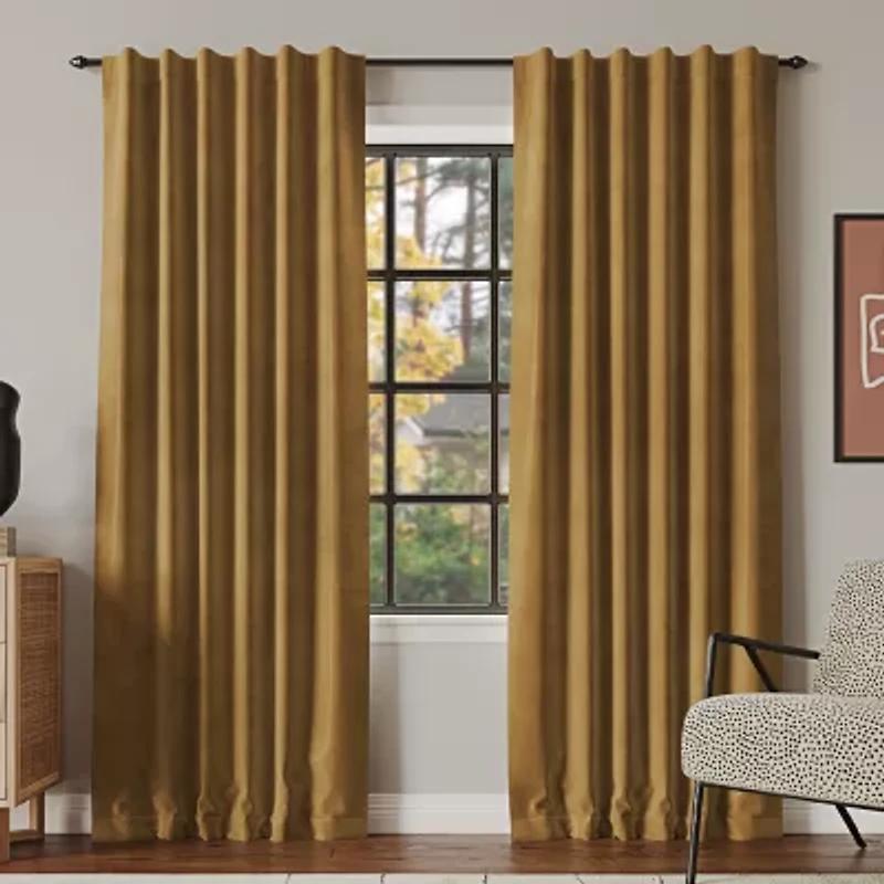 Featuring a decadent velvet fabric, sun zero Amherst curtain panels add luxe appeal to any room of your home. Equipped with hidden back tabs for easy hanging on standard curtain rods up to 1.5" in diameter. Sun zero extreme blackout thermal lining is laboratory tested to block out 100% of light, reduce outside noise by up to 40%, and decrease energy lost through your windows by up to 40%. Comfort is optimized with thermal properties that help keep summer heat and winter chill out of your home. Built-in hidden back tabs on reverse side allow for easy slide-through installation on curtain rods up to 1.5" in diameter. Hang in your entertainment room to eliminate screen glare and reduce distracting outside noise, or in your bedroom for enhanced privacy and a sounder, more uninterrupted sleep. Sold as individual panels measuring 50" width by 108" length. Measure carefully before selecting your desired size and quantity. Machine wash cold on gentle cycle. Use non-chlorine bleach when needed. Tumble dry on low heat, using a cool iron as needed.