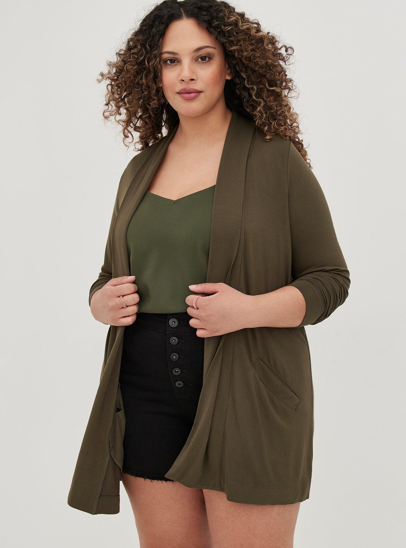 FIT Longer length. Measures 34'' from shoulder (size 2). MATERIALS + CARE Super Soft knit fabric: An incredibly soft, versatile knit that hugs close to the body. Stretch level: Maximum. 95% rayon, 5% spandex. Machine wash cold. Line dry. Imported. DETAILS Straight, open front. Long sleeves. Front pockets.