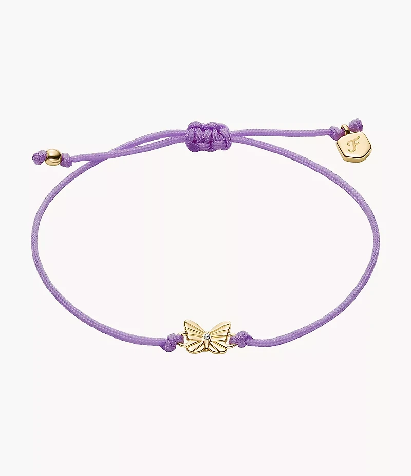 Add some color to your stack! This bracelet features a delicate butterfly charm in polished gold-tone brass. A colored cord with a slider closure allows for easy adjustability, ensuring a comfortable and secure fit.
