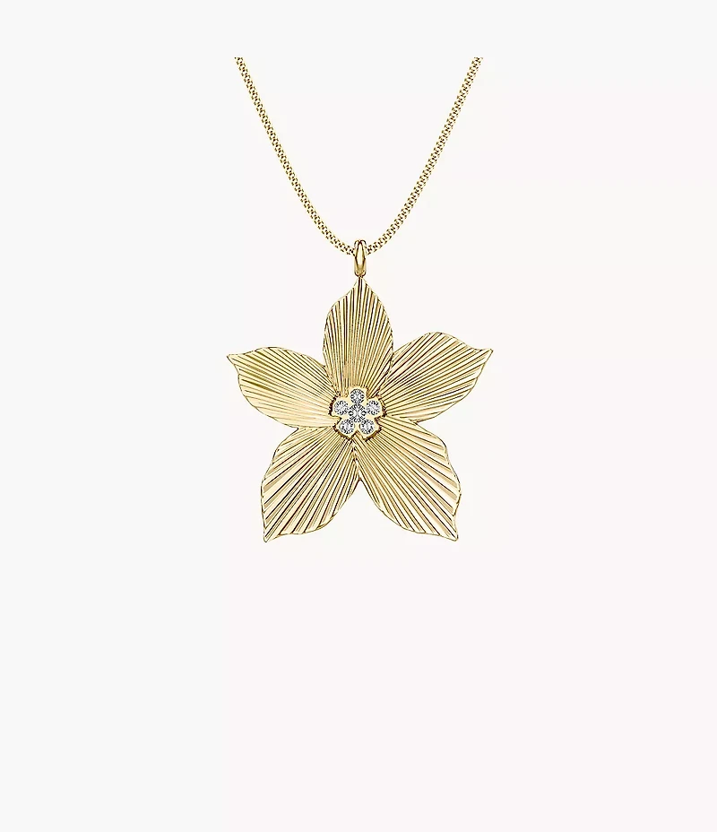 The Flower Collection blends organic form with modern detail, creating a balanced and refined floral-inspired silhouette. Crafted in polished gold-tone stainless steel, this textured petal pendant necklace features a delicate chain secured by a lobster clasp.