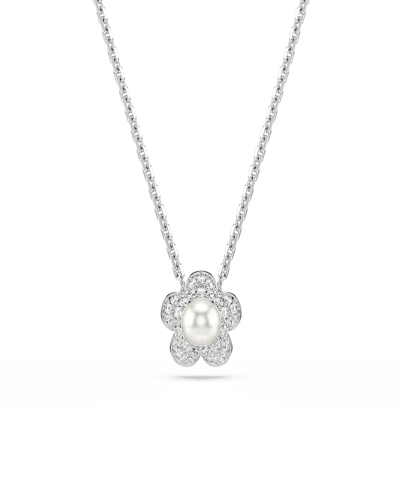 In a gentle tribute to nature, this rhodium plated pendant portrays a delicate flower, made with a Swarovski Crystal Mother of Pearl center and petals adorned in glittering pave. Wear it together with the matching studs to give any look a radiant touch of understated luxury.