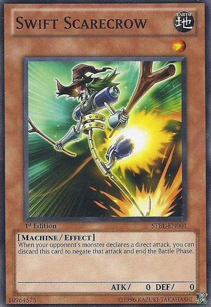 Passcode: 18964575 Set: Starstrike Blast ATK/DEF: 0/0 Card Number: STBL-EN001 Monster Type: Machine Rarity: Common Attribute: Earth Card Text: When your opponent's monster declares a direct attack , you can discard this card to negate that attack and end the Battle Phase. Level: 1 Card Type: Effect Monster Name: Swift Scarecrow Edition: 1st