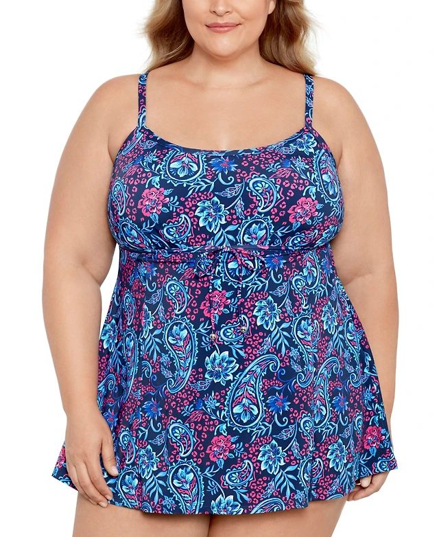 Swim Solutions Plus Size Tummy Control Printed Tie-Waist Swim Dress, Created for Macy's