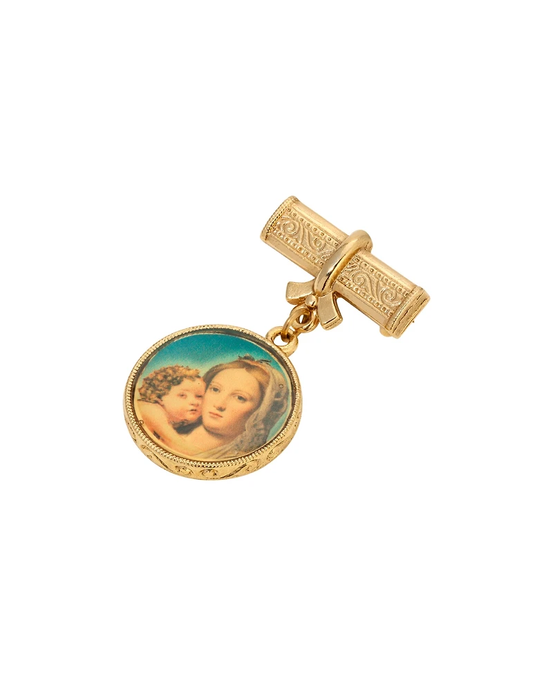 This vintage-inspired 14K gold dipped bar pin features a detailed scrollwork design and a suspended round charm showcasing a vivid image of the Mary and Child. The artwork is framed in a textured bezel, adding depth and visual interest to the piece.