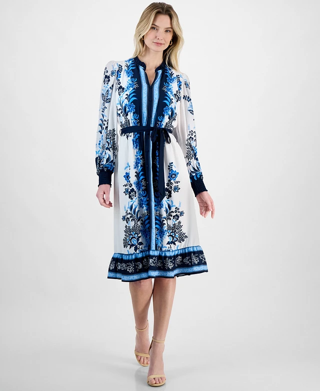 T Tahari Women's Printed Elbow-Sleeve Tie-Waist Split-Neck Midi Dress