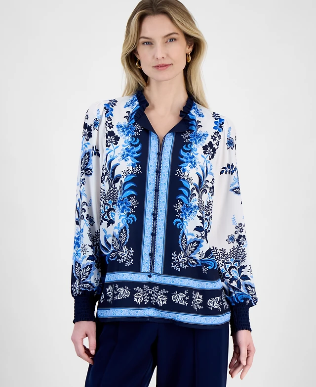 T Tahari Women's Printed Blouson-Sleeve Blouse