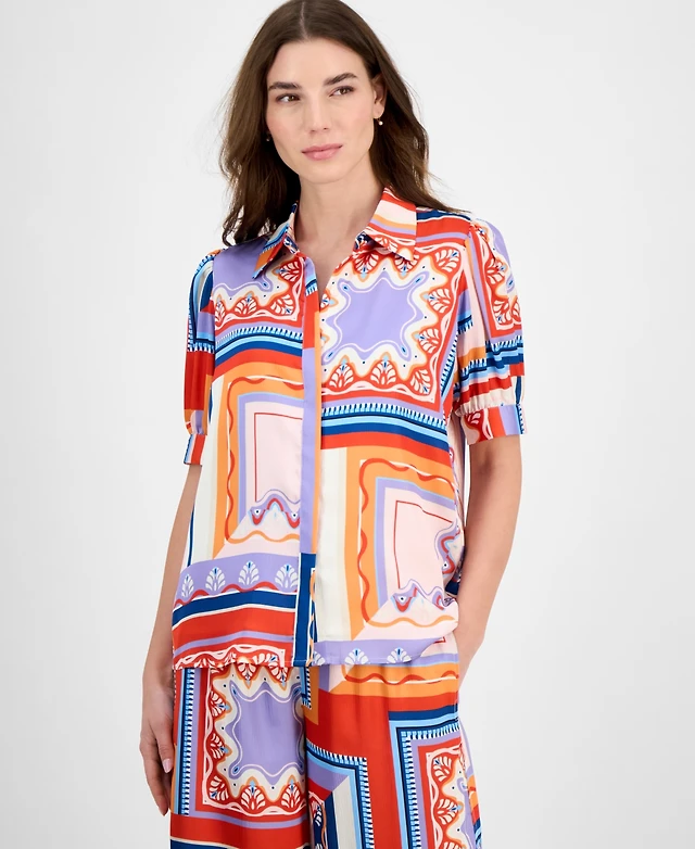 T Tahari Women's Printed Short-Sleeve Button Blouse
