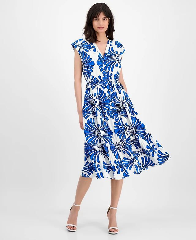 T Tahari Women's V-Neck Button-Front Fanned-Print Midi Dress