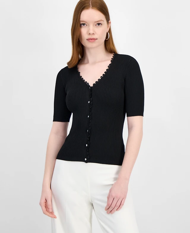 T Tahari Women's V-Neck Button-Front Ribbed-Knit Top