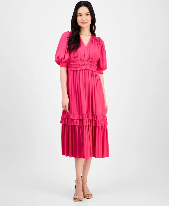 T Tahari Women's Puff-Sleeve Belted Tiered Dress