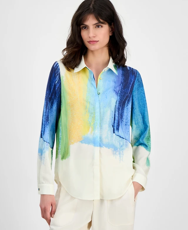 T Tahari Women's Watercolor-Print Long-Sleeve Blouse