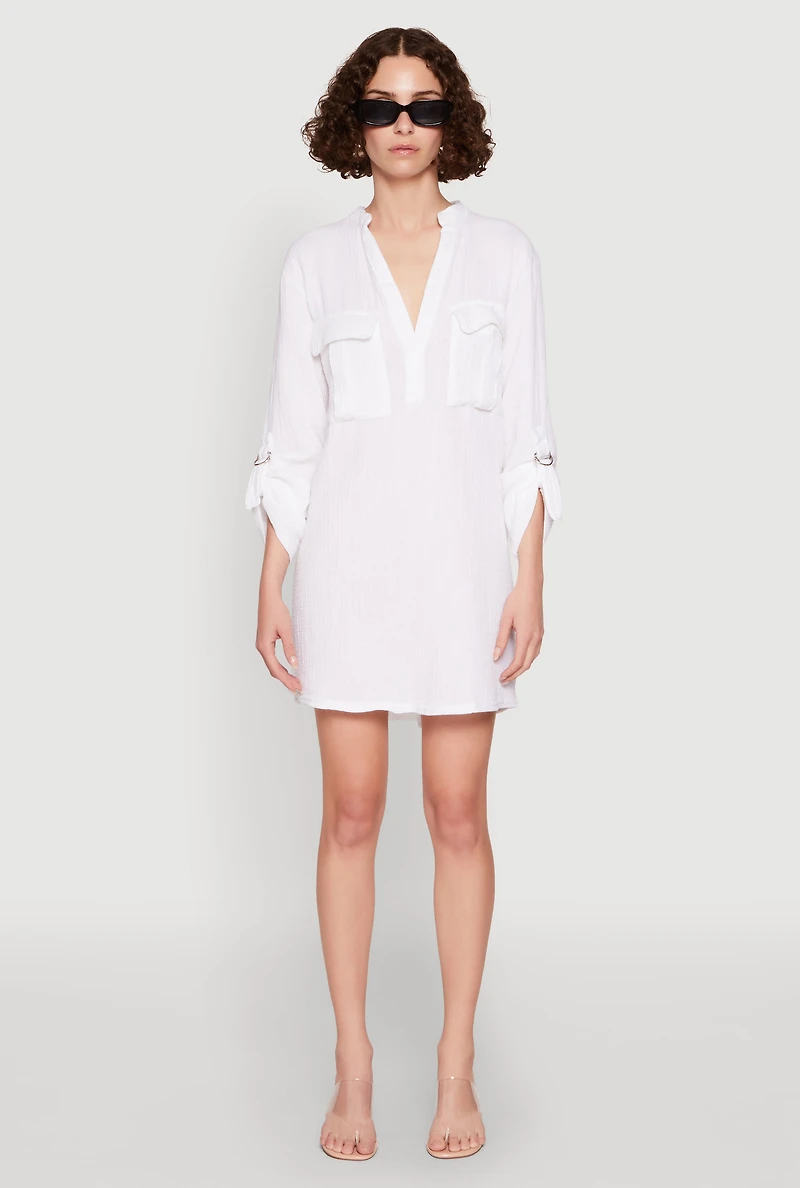 Step into effortless style with the Tabbed Sleeve Gauze Knit Dress, the perfect blend of comfort and chic for your casual days. Its classic fit and timeless sundress silhouette make it a go-to choice for those laid-back weekends or brunch dates. The breathable gauze knit fabric keeps you cool while the notch neckline and 3/4 sleeves add just the right touch of flair. Whether you're strolling through the park or catching up with friends, this short-length dress is your new wardrobe essential that makes every moment feel stylish and easy.