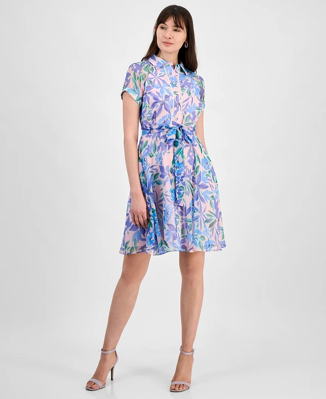 Tahari Women's Shadow-Striped Floral-Print Belted Dress