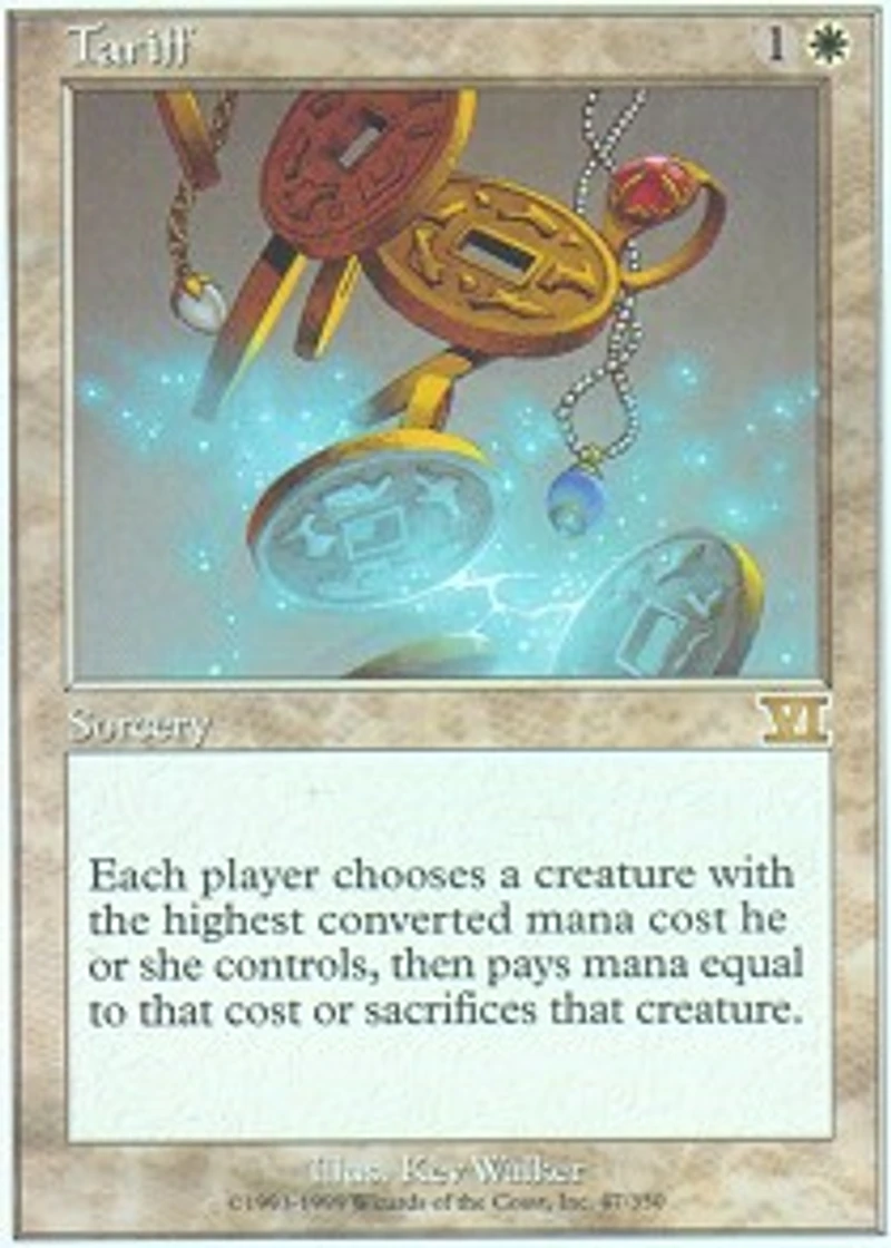 Color: White Card Text: Each player sacrifices the creature he or she controls with the highest converted mana cost unless he or she pays that creature's mana cost. If two creatures a player controls are tied for highest cost , that player chooses one. Rarity: R Cost: 1W Card Type: Sorcery Name: Tariff Finish: Regular Set Name: Weatherlight