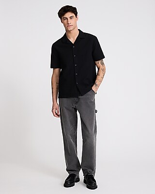 A breathable cotton short sleeve shirt complete with a camp collar, a full button front, and a textured circle pattern.