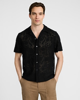 The perfect warm-weather shirt designed with a camp collar, full button front, and a textured floral raised jacquard fabric. Layer with your favorite tank for a modern layered look or by itself for an ideal vacation style.