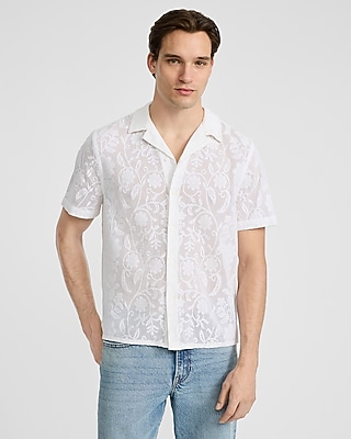 The perfect warm-weather shirt designed with a camp collar, full button front, and a textured floral raised jacquard fabric. Layer with your favorite tank for a modern layered look or by itself for an ideal vacation style.