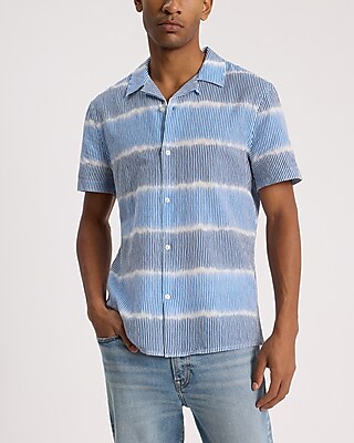 Complete with a textured dobby fabric and a striped pattern, this cotton short sleeve shirt features a button down front and a camp collar.