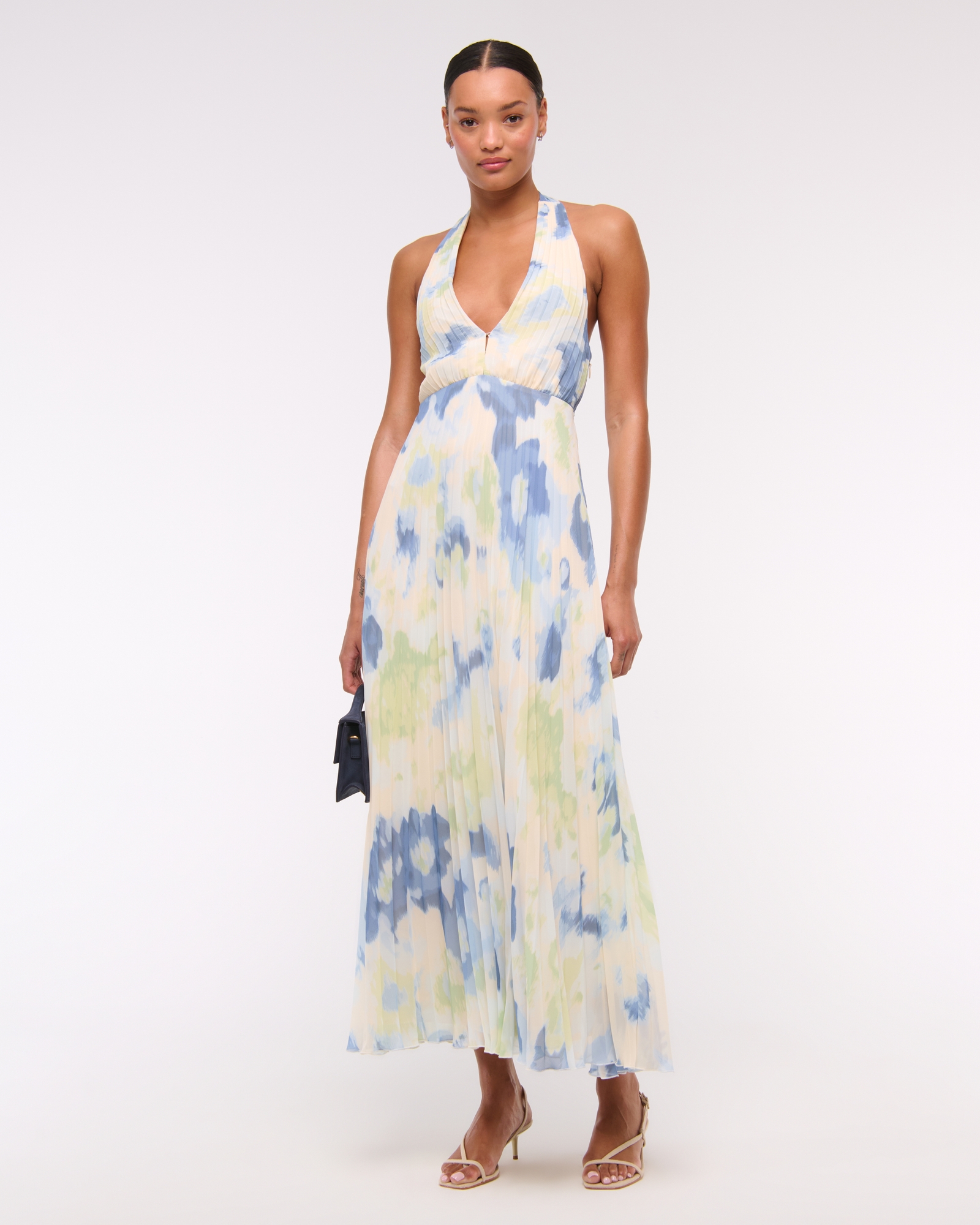 Flattering maxi dress in our ultra sheer crepe fabric, featuring all-over pleating details and a plunging halter neckline with adjustable ties for the perfect fit.