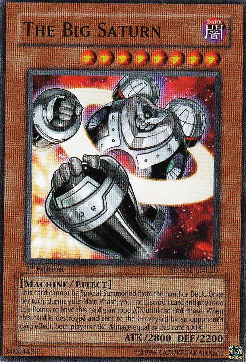 Passcode: 34004470 Set: Structure Deck: Machina Mayhem ATK/DEF: 2800/2200 Card Number: SDMM-EN020 Monster Type: Machine Rarity: Common Attribute: DARK Card Text: You cannot Special Summon this card from your hand or Deck. Once per turn , you can discard 1 card and pay 1000 Life Points to have this card gain 1000 ATK until the end of the turn. When this card is destroyed and sent to the Graveyard by your opponent's card effect inflict damage to both players equal to this card's ATK. Card Type: Effect Monster Name: The Big Saturn Edition: Unlimited