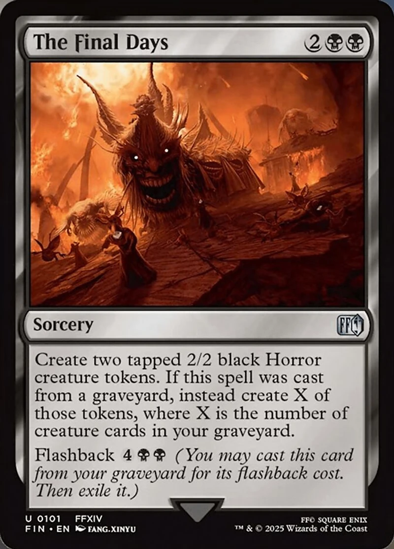 Color: Black Rarity: U Cost: 2BB Card Type: Sorcery Artist: Fang Xinyu Name: The Final Days Finish: Regular Card Number: 0101 Set Name: Final Fantasy